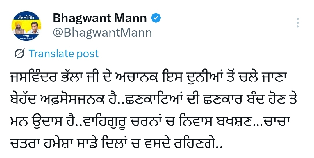 ਮੁੱਖ ਮੰਤਰੀ ਭਗਵੰਤ ਮਾਨ ਨੇ ਆਪਣੇ ਸੋਸ਼ਲ ਮੀਡੀਆ ਹੈਂਡਲ ਐਕਸ 'ਤੇ ਟਵੀਟ ਕਰਦੇ ਹੋਏ ਲਿਖਿਆ, "ਜਸਵਿੰਦਰ ਭੱਲਾ ਜੀ ਦੇ ਅਚਾਨਕ ਇਸ ਦੁਨੀਆਂ ਤੋਂ ਚਲੇ ਜਾਣਾ ਬੇਹੱਦ ਅਫ਼ਸੋਸਜਨਕ ਹੈ..ਛਣਕਾਟਿਆਂ ਦੀ ਛਣਕਾਰ ਬੰਦ ਹੋਣ ਤੇ ਮਨ ਉਦਾਸ ਹੈ..ਵਾਹਿਗੁਰੂ ਚਰਨਾਂ ਚ ਨਿਵਾਸ ਬਖਸ਼ਣਚਾਚਾ ਚਤਰਾ ਹਮੇਸ਼ਾ ਸਾਡੇ ਦਿਲਾਂ ਚ ਵਸਦੇ ਰਹਿਣਗੇ.."