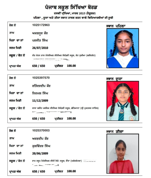 ਪੰਜਾਬ ਸਕੂਲ ਸਿੱਖਿਆ ਬੋਰਡ ਵੱਲੋਂ 10ਵੀਂ ਕਲਾਸ ਵਿਦਿਅਕ ਸੈਸ਼ਨ 2024-25 ਦੀਆਂ ਲਈਆਂ ਗਈਆਂ ਪ੍ਰੀਖਿਆਵਾਂ ਦਾ ਨਤੀਜਾ ਅੱਜ ਐਲਾਨ ਦਿੱਤਾ ਗਿਆ ਹੈ। ਪੰਜਾਬ ਸਕੂਲ ਸਿੱਖਿਆ ਬੋਰਡ ਦੇ ਚੇਅਰਮੈਨ ਡਾ. ਅਮਰਪਾਲ ਸਿੰਘ ਵੱਲੋਂ ਨਤੀਜੇ ਦਾ ਐਲਾਨ ਕੀਤਾ ਗਿਆ। ਬੋਰਡ ਵੱਲੋਂ 10ਵੀਂ ਕਲਾਸ ਦੇ ਐਲਾਨੇ ਗਏ ਨਤੀਜੇ ਵਿੱਚ ਫਰੀਦਕੋਟ ਜ਼ਿਲ੍ਹੇ ਦੀ ਅਕਸ਼ਨੂਰ ਕੌਰ ਨੇ ਪਹਿਲਾ ਸਥਾਨ ਪ੍ਰਾਪਤ ਕੀਤਾ। ਦੂਜੇ ਨੰਬਰ ਉਤੇ ਰਤਿੰਦਰਦੀਪ ਕੌਰ ਜ਼ਿਲ੍ਹਾ ਸ੍ਰੀ ਮੁਕਤਸਰ ਸਾਹਿਬ ਅਤੇ ਤੀਜਾ ਸਥਾਨ ਅਰਸ਼ਦੀਪ ਕੌਰ ਨੇ ਪ੍ਰਾਪਤ ਕੀਤਾ।